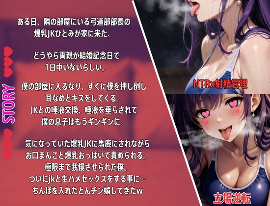 隣の部屋にいる弓道部部長の爆乳JK(18歳)ひとみ。 ある日、両親が結婚記念日でいないと言って部屋に押しかけてくる。 普段はお淑やかなな彼女が自分はど変態の甘サドだったとは。 カウントダウン方式でJKに射精管理される、背徳感マックスの最高の時間が始まる。